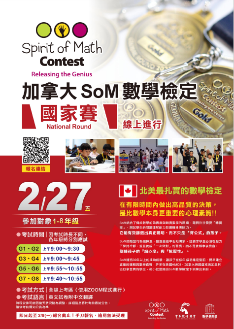 | 一、 | 2026加拿大SoM數學檢定在全球範圍內舉辦,為1至8年級的學生提供準備、應用和在全球舞台上展示知識的機會。 |