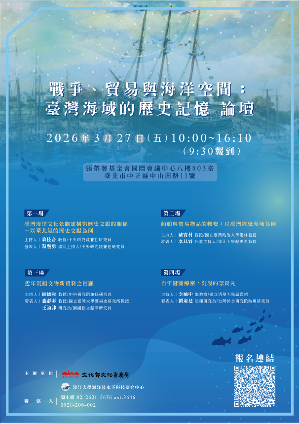 | 二、 | 本論壇透過發表近年執行水下文化資產文史彙整相關計畫初步研究成果,並邀請相關領域專家學者分享臺灣海域戰爭相關沉船、貿易發展、沉船文物與海洋空間等議題,期能增益大眾瞭解臺灣過去的歷史文化並提升對水下文化資產的認識。 |