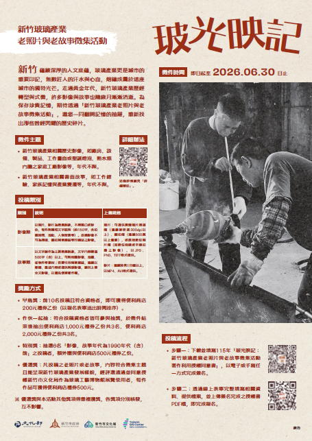 | 一、 | 為保存與推廣新竹玻璃產業發展歷史記憶,充實相關文史資料,廣邀民眾提供與新竹玻璃產業相關之歷史資料,共同見證城市產業發展軌跡。 |